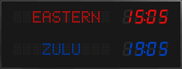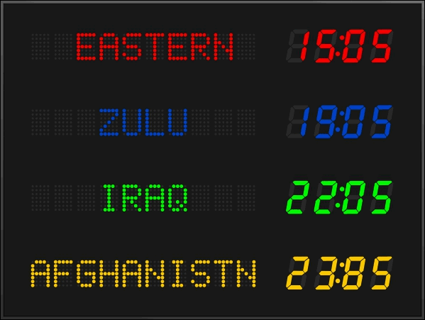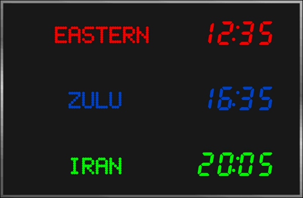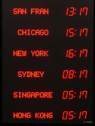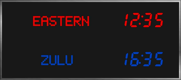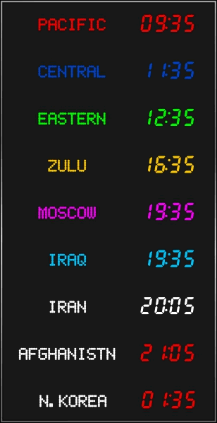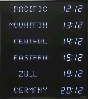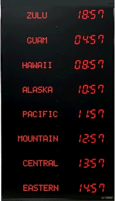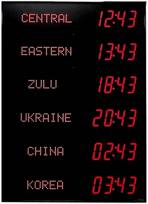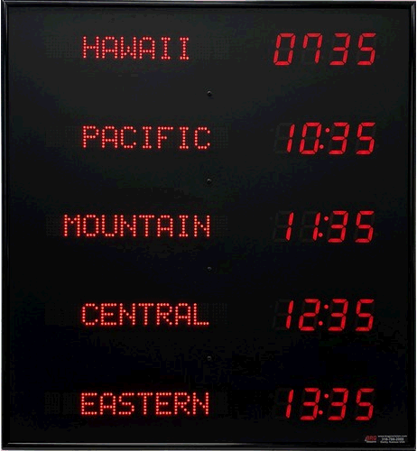 4 Zone Time Zone Clock with Yellow LEDs for the Zone Labels. |