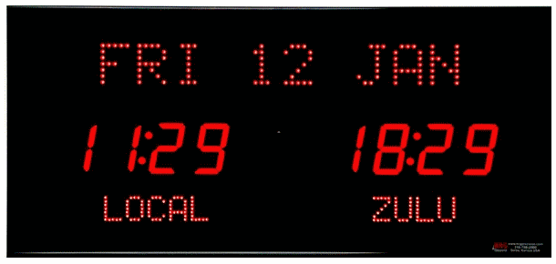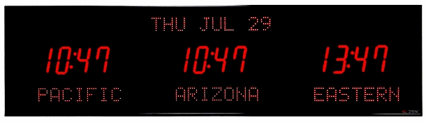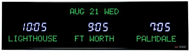 | 6618P-M16-AB | 2 Zone Clock with 2.5 " red bar segment LEDs for the time, 2.0" red dot matrix LEDs for the zone labels and 2.0" red 20 character alphanumeric date. This clock has optional seconds added to the second zone and has an auto-brightness option. | |