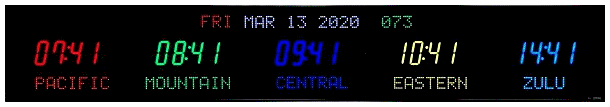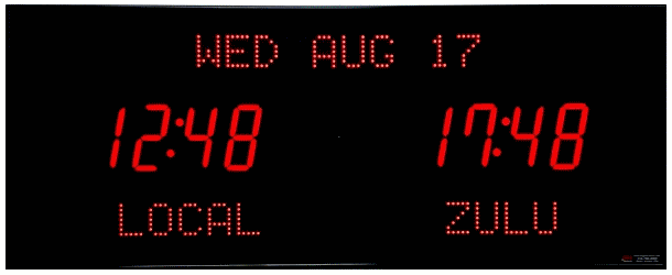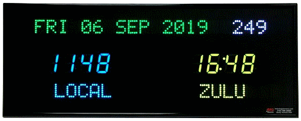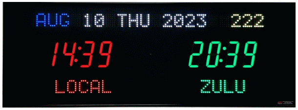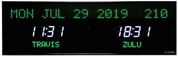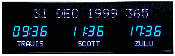 | 6618X | 2 Zone Clock with 4.0" blue bar segment LEDs for the time, 2.0" yellow dot matrix LEDs for the zone labels and 2.0" yellow 20 character alphanumeric date |