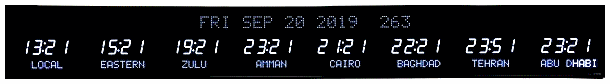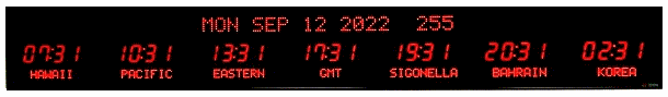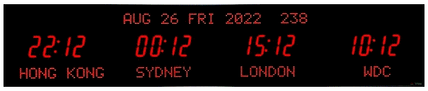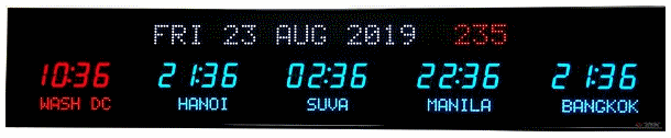 The 6618 series LED digital world time zone clocks have bar-segment LED time displays with a ten character dot matrix digital zone label below and either a ten or twenty character date at the top of the clock. More zones may be displayed than physically available by page flipping to another set of zones – For example, a 5 zone display can actually display up to 20 zones by page flipping through 4 sets of zones. Selected zones can remain constant while other zones change.