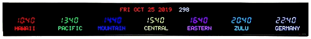 | 6618W | 8 Zone Clock with 2.5" blue bar segment LEDs for the time, 1.2" green dot matrix LEDs for the zone labels and 2.0" yellow 20 character alphanumeric date | |