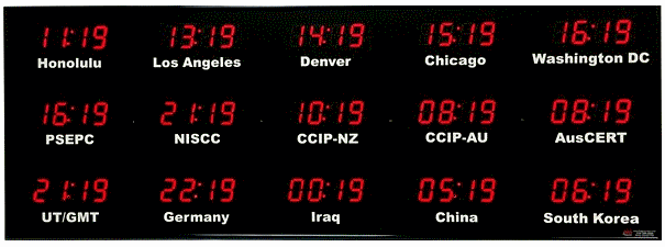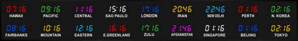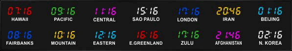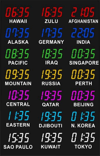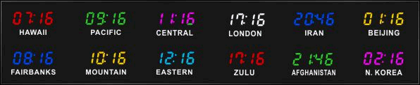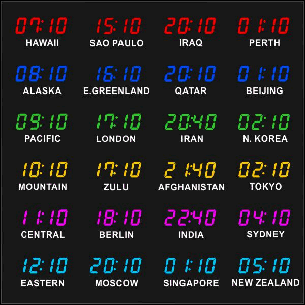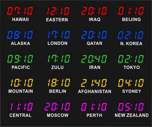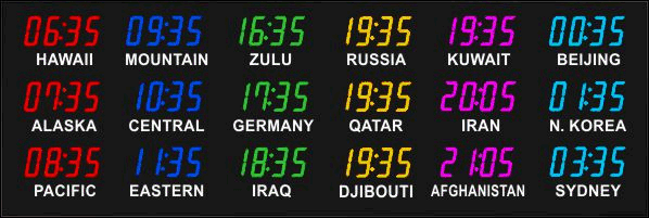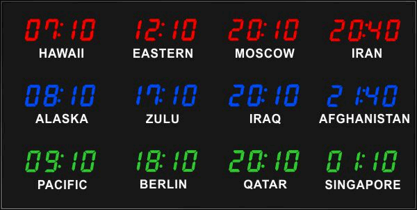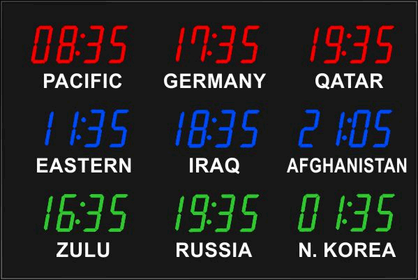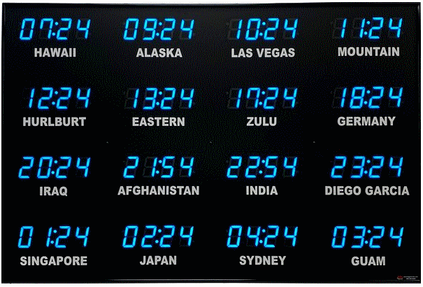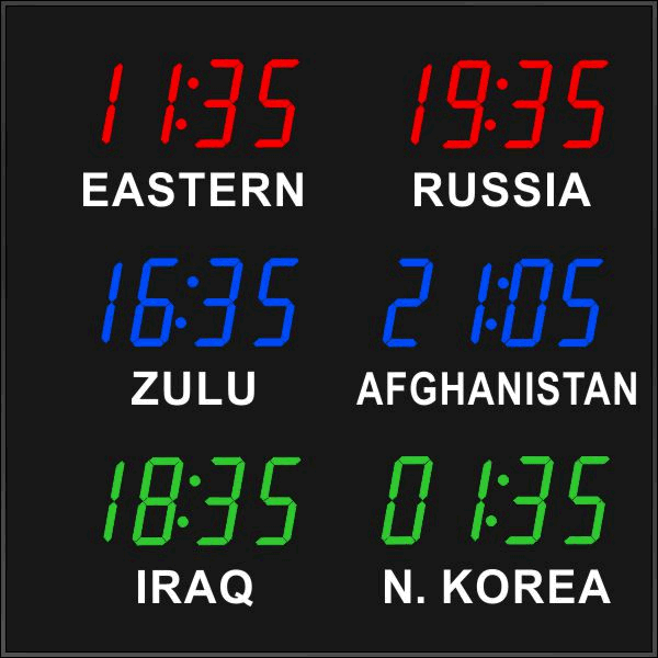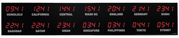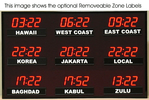 The 662 series time zone clocks have bar-segment LED time with white vinyl zone labels below the time of each zone. The 662 models can display 4 to 24 time zones.