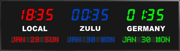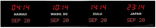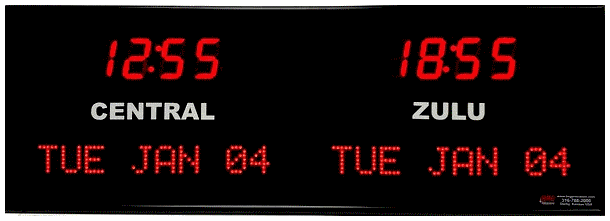 6637C | 4 Zone Clock with 1.8" standard red bar segment LEDs for the time, green 1.2" dot matrix LEDS for the date and 0.75" white vinyl lettering for the zone labels. | |