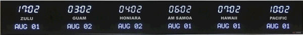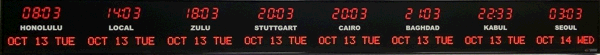The 6637 series time zone clocks have bar-segment LED time with white vinyl zone labels in the middle of each zone. The date is displayed with 10 character dot matrix LEDs. 6637 models can display 2-8 time zones.
