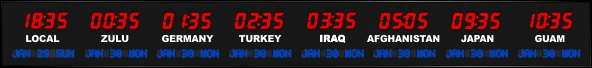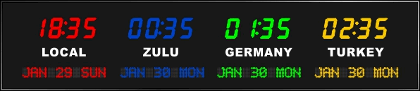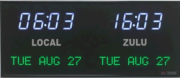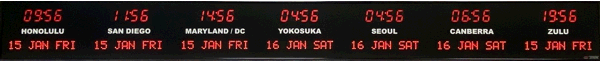6637E | 6 Zone Clock with 1.8" blue bar segment LEDs for the time, yellow 1.2" dot matrix LEDS for the date and 0.75" white vinyl lettering for the zone labels. | |