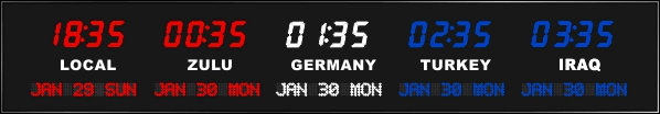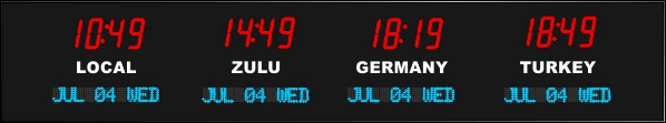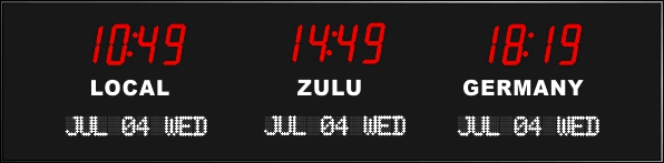 6637I-RL | 3 Zone Clock with 2.5"red bar segment LEDs for the time, 1.2" red dot matrix LEDS for the date and optional removable 1.0" white vinyl lettering for the zone labels. | |