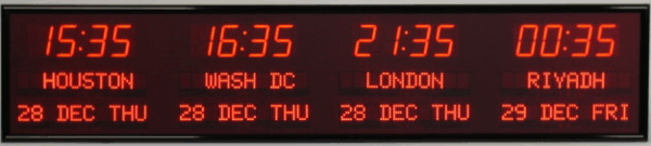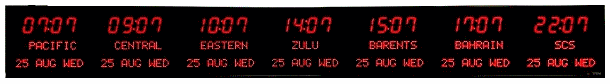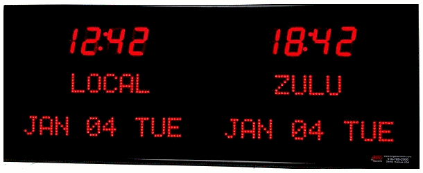 6673R | 8 Zone Clock with 2.5 " red bar segment LEDs for the Time and green 1.2" dot matrix LEDs for the date & zone labels |