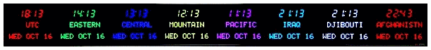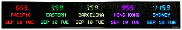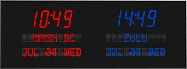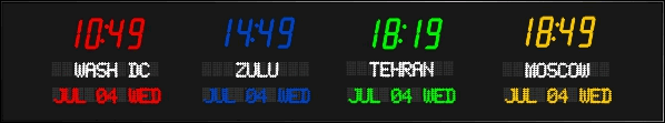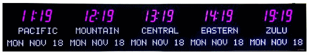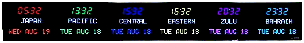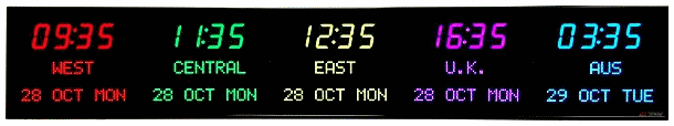 6673P | 6 Zone Clock with standard 2.5" red bar segment LEDs for the Time, 1.2" green dot matrix LEDs for the zone labels and 1.2" yellow dot matrix LEDs for the date | |